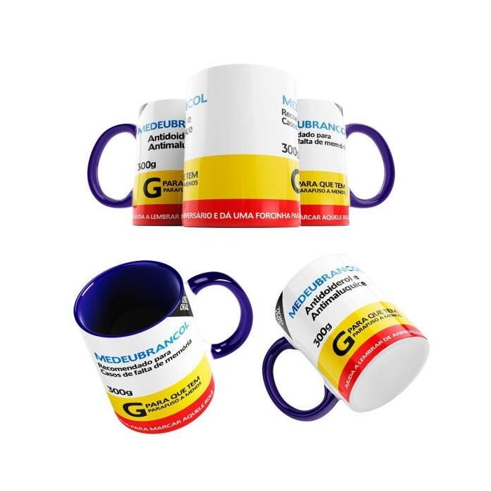 1x Caneca Azul Engraçada Me Deu Branco Caixa Remédio Rótulo