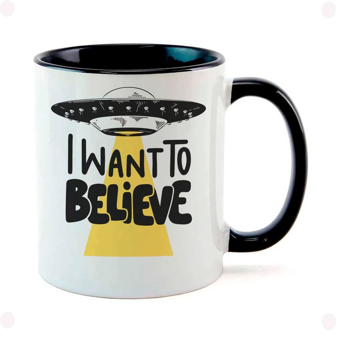 Caneca Branca com Interna Preta Y5 Alien Nave Ovni Frase I Want To Believe Branca