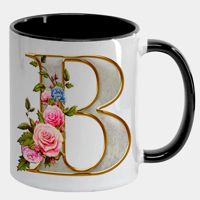 Caneca Branca com Interna Preta Y5 Letra B Alfabeto Fofo Flor