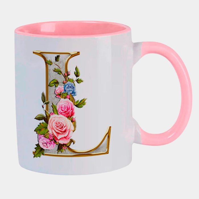Caneca Branca com Interna Rosa Y4 Letra L Alfabeto Fofo Flor