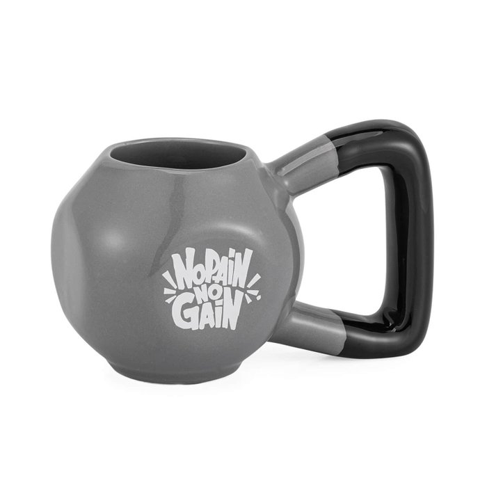 Caneca com shape 3D em formato de peso de academia, em cerâmica decorada com a frase No Pain, No Gain.