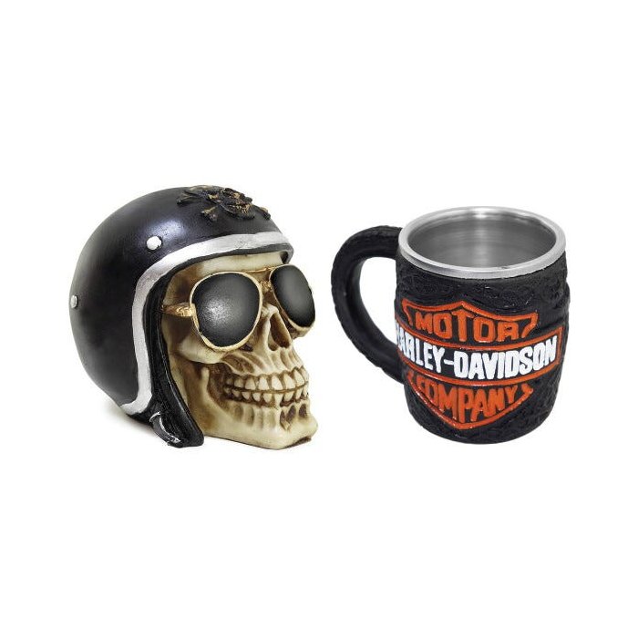Kit decorativo completo inclui: 1 Caneca Harley em resina e metal: 10,5x9,5x cm / 350ml 1 Crânio com capacete em resina: 14,5x12,5x13 cm Obs.: Peças artesanais, podem apresentar variações na tonalidade. REF.: D801 D1440 (BM)