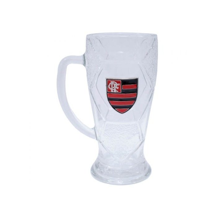 Caneca de vidro com capacidade para 630 ml, corpo enfeitado no detalhe de uma bola de futebol, gravado com um brasão de metal do Flamengo. Material: vidro