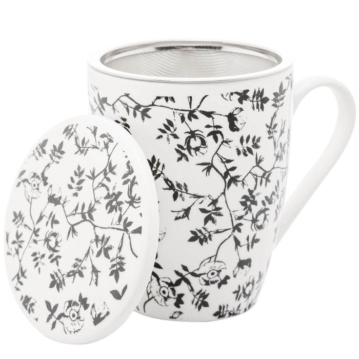 Caneca de Porcelana com Tampa e Filtro Lyor Xícara de Chá 310ml Super White Tiny Flowers
