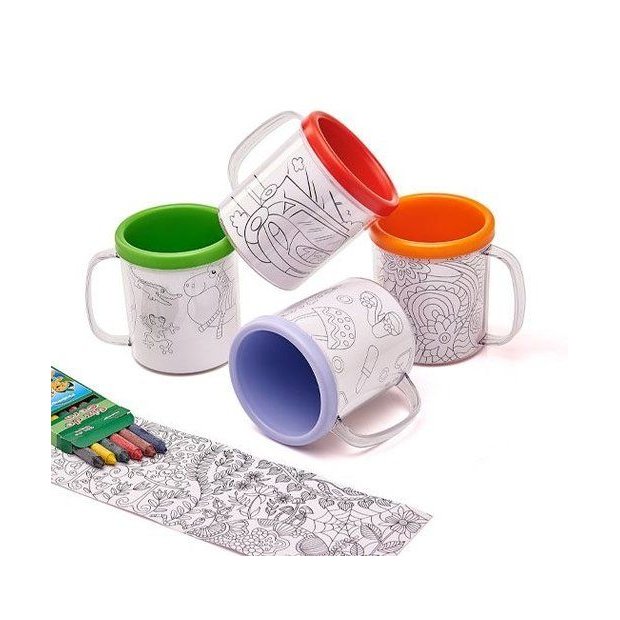 Com ela, os pequenos podem personalizar e deixar a caneca com a sua cara. Disponível em diversas cores, é acompanhada de rótulos de desenhos variados para colorir e um kit de giz de cera com 6 cores.