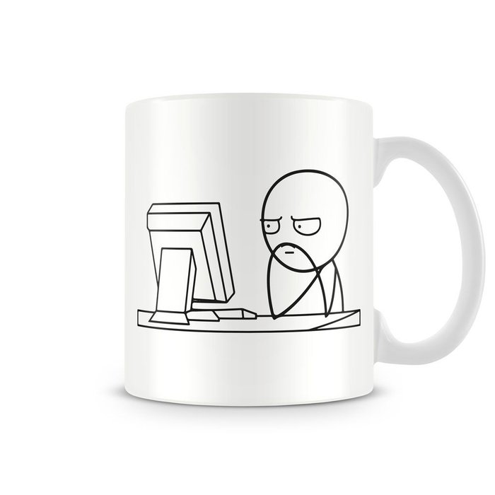 Caneca meme pensativo no computador branco
