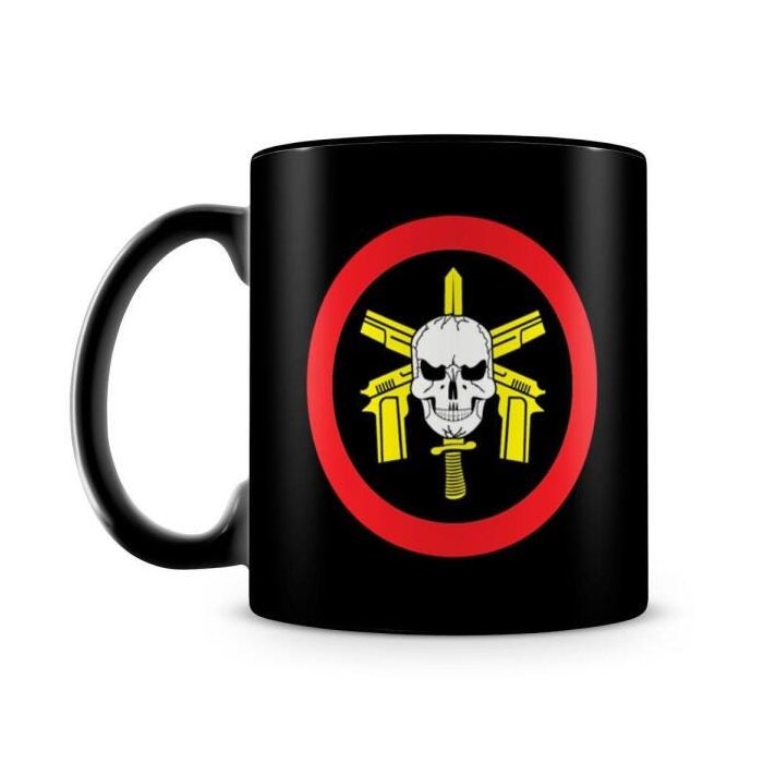 Caneca personalizada de porcelana de alto brilho, interior e alça 100% preta com estampa do brasão do BOPE.