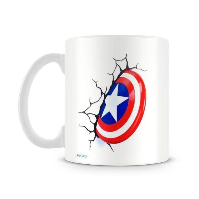 Caneca personalizada de porcelana de alto brilho com estampa escudo do capitão américa 3D. Uma super caneca para os nerds de plantão.