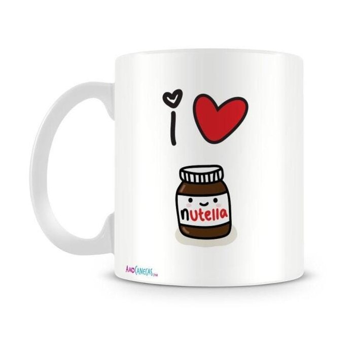 Caneca personalizada de porcelana com linda estampa Eu Amo Nutella. Essa é pra quem não fica longe desta gostosura!