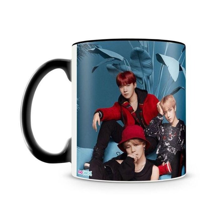Caneca personalizada de porcelana de alto brilho, interior e alça preta com estampa do grupo BTS.