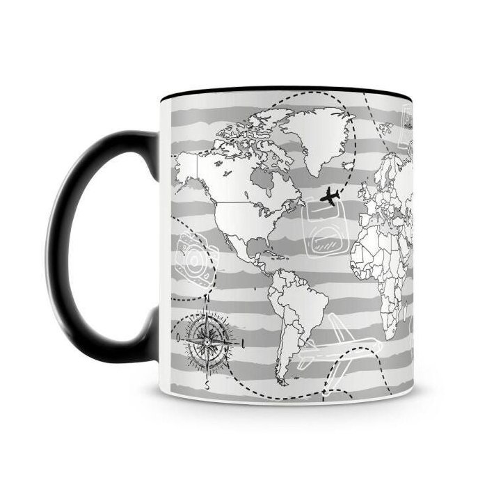 Essa caneca com estampa do mapa mundi é perfeita para isso e ainda mais, você pode anotar lugares que ainda pretende conhecer.