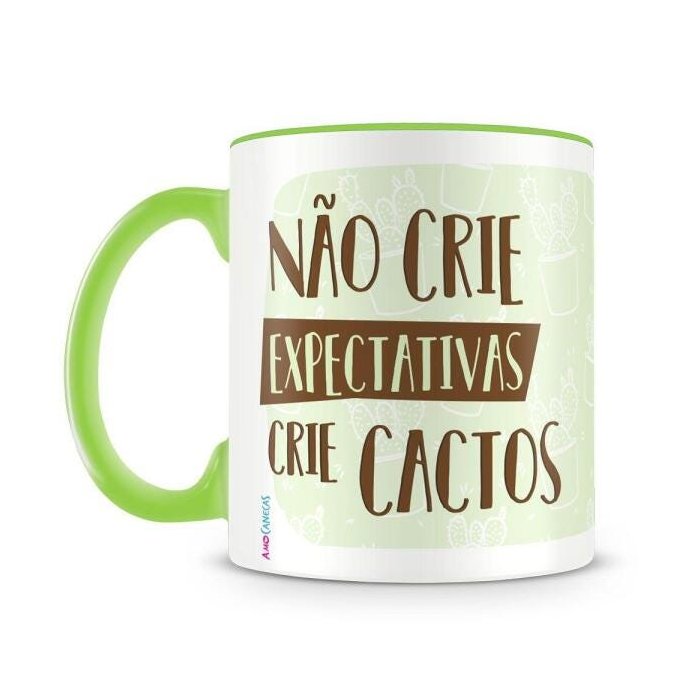 Caneca personalizada de porcelana de alto brilho interior e alça verde claro com a frase "Não crie expectativas crie cactos".
