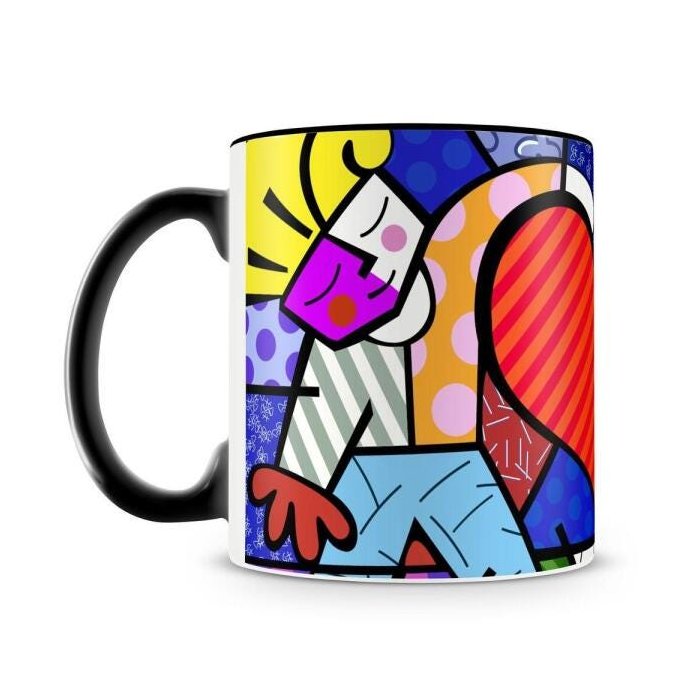 Caneca personalizada de porcelana de alto brilho interior e alça preta com estampa da pintura Hearts Kids do artista plástico Romero Britto.