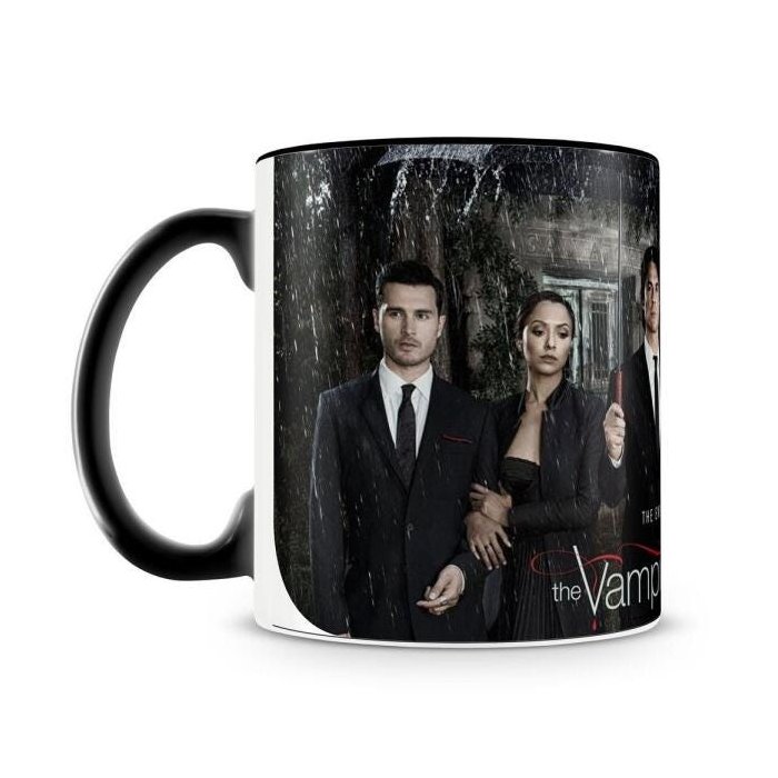 Caneca personalizada de porcelana de alto brilho interior e alça preta com linda estampa do seriado The Vampire Diaries.