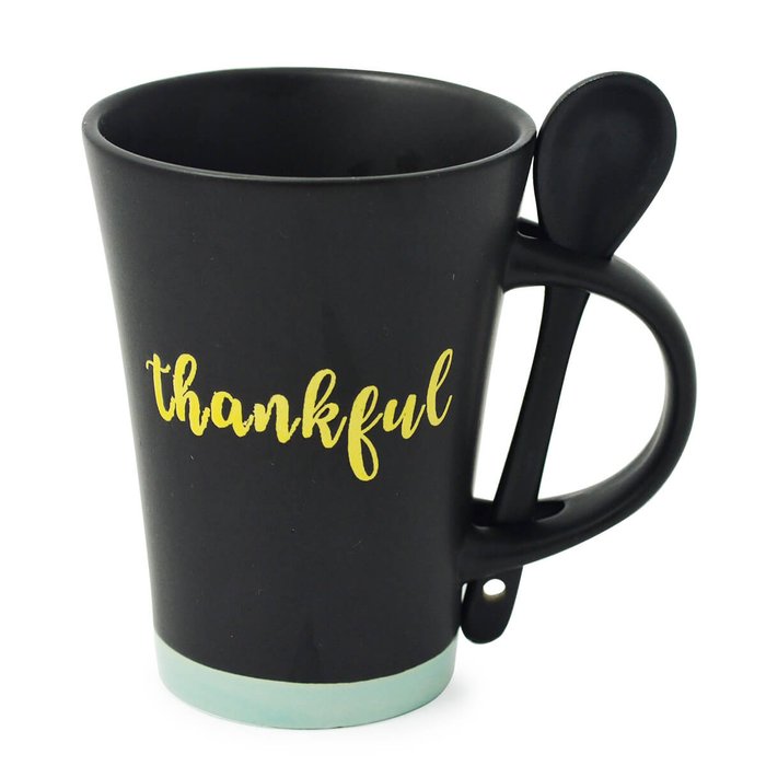 Caneca Preto fosco Thankful com Colher base Azul 310ml