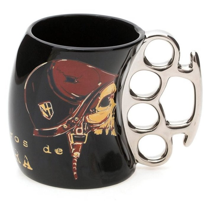Ela vem com alça metálica no formato de um soco inglês e é perfeita para quem quer ter sempre algo diferente e inovador decorando a cozinha. A caneca é feita de bone china, um tipo de porcelana que tem como material principal ossos de animais.