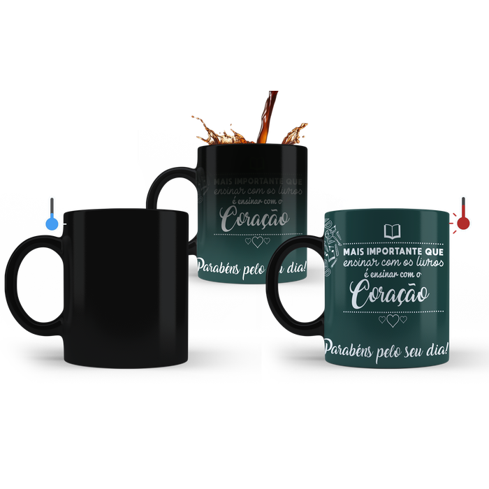 Caneca mágica de porcelana termosensível com interior branco, com estampa do dia dos Professores.