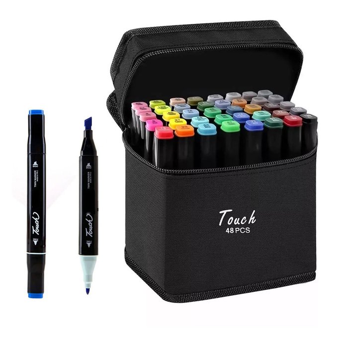 As canetas são de ponta dupla, duas pontas padrão, grossa e fina. Os marcadores são a base de álcool e não contém cheiro, ideal para crianças.