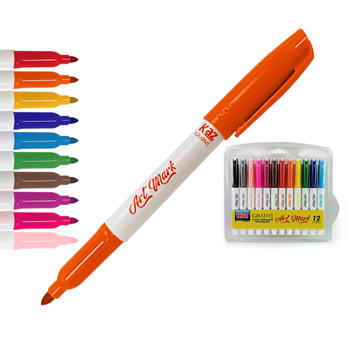 O Kit de Marcadores Permanentes Kaz Criative Art Mark com 12 cores foi pensado para estudos, artesanato e rotulagem no dia a dia, oferecendo traço consistente com ponta média de 2 mm, secagem rápida e alta cobertura em superfícies lisas ou porosas como papel, papelão, plástico e etiquetas. A tinta pigmentada permanente garante boa aderência e durabilidade, enquanto o corpo em resina termoplástica com pavio de acetato e ponta de fibra de poliéster assegura resistência e uso prolongado. Com paleta vibrante e design prático, é ideal para estudantes, professores, artistas e profissionais de organização, em casa, na escola, no escritório ou em ateliês, proporcionando resultados nítidos e coloridos com excelente custo-benefício