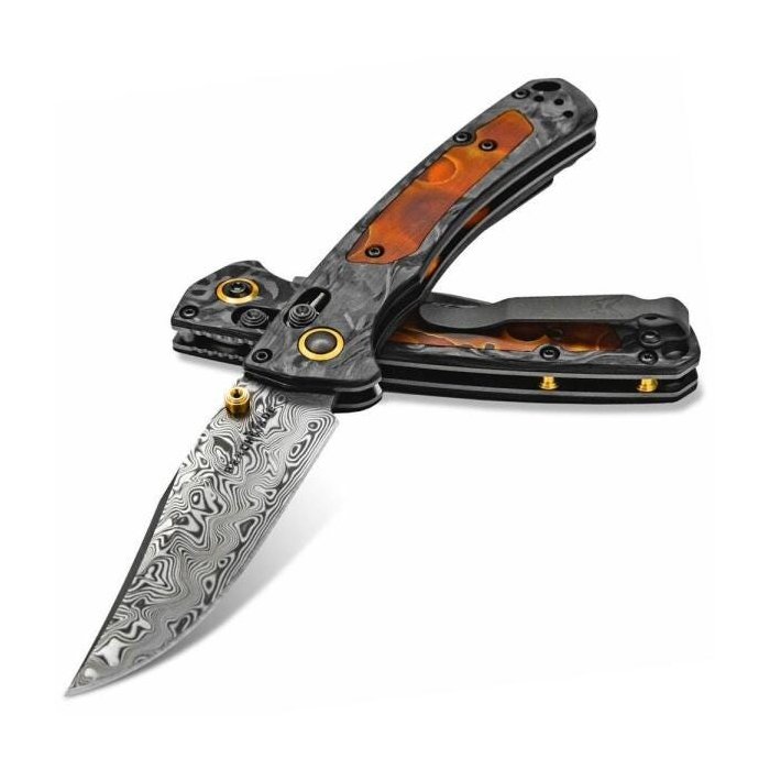 Canivete Benchmade Mini Crooked River Aço Damasco Empunhadura de Fibra de Carbono Preto e Laranja