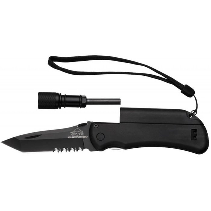 O canivete de sobrevivência Guepardo Survival fabricado pela Nautika é perfeito para qualquer tipo de aventura independente de qual seja, pesca, camping, entre outros. A construção super resistente desse canivete multifuncional NTK é formada por inox 420, formando sua lâmina de ótima perfuração e que também possui uma parte serrilhada, ideal para cortar coisas fibrosas, e seu cabo em plástico ABS, tornando o item mais leve e de fácil manuseio. O inox 420 também tem a característica de possuir grande retenção do fio de corte. Esse canivete compacto contém mini lanterna em LED, pederneira, um apito de emergência, trava de segurança, cordão de nylon preto ao fim de seu cabo e um revestimento antirreflexo por toda sua superfície. Suas dimensões quando fechado, fazem o canivete Guepardo militar preto ser fácil de guardar, podendo até ir nos bolsos de calças.