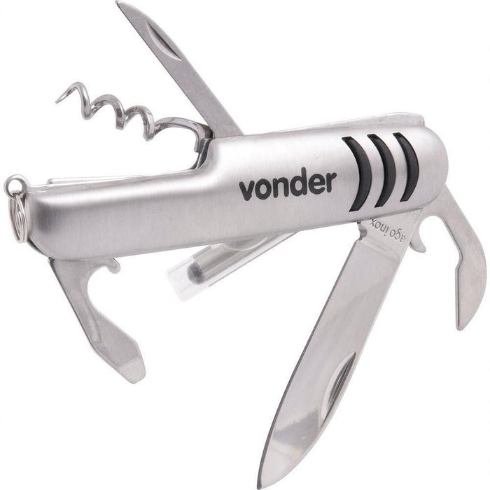 Acessórios que compõe o canivete multiuso: Possui abridor de latas, garrafas e saca-rolhaComprimento da lâmina do canivete: 60 mmComprimento total do canivete: 150 mmComprimento fechado: 90 mmMaterial da lâmina do canivete: Aço inoxMaterial do cabo do canivete: Aço inox Produto: Canivete