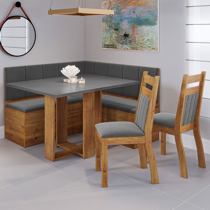 Canto Alemão Nigro com 2 Cadeiras Mel/cinza Brilho/veludo Grafite - Viero Móveis Cinza