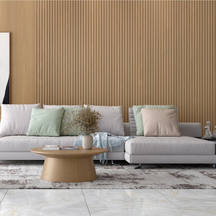 Acabamento em L ou Cantoneira: Assim como os acabamentos macho e fêmea, o acabamento em L é produzido com substrato MDF RU (resistente a umidade), recebe o mesmo revestimento realizado nas Barras e acessórios macho e fêmea do Ripado Eucatex O acabamento em L ou Cantoneira possibilita a finalização perfeita dos topos nas instalações de painéis à meia altura (exemplo: cabeceiras de cama).