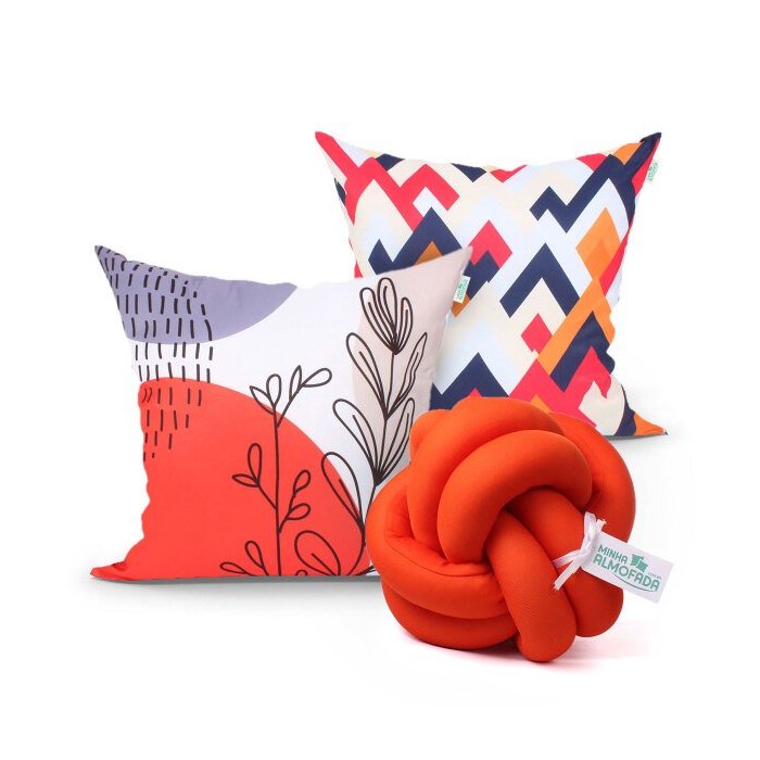 Capa Almofada Laranja Estampada Decorativa 2 Unidades 45cm x 45cm + Almofada de Nó Escandinavo