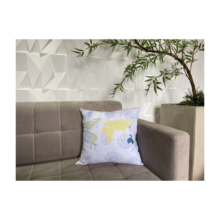 A capa de almofada é confeccionada em tecido totalmente estampado (frente e verso), sendo a frente com estampa do mapa-múndi e o verso com estampa de fundo. A estampa mapa Brasil, possui duas variações de cores: branco e verde.