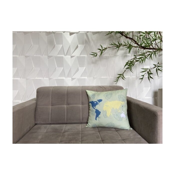 A capa de almofada é confeccionada em tecido totalmente estampado (frente e verso), sendo a frente com estampa do mapa-múndi e o verso com estampa de fundo. A estampa mapa Brasil, possui duas variações de cores: branco e verde.