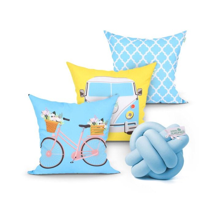 Capa Almofada para Cama Estampada Azul Decorativa Kit 3 Unidades 45cm x 45cm + Almofada Nó Escandina