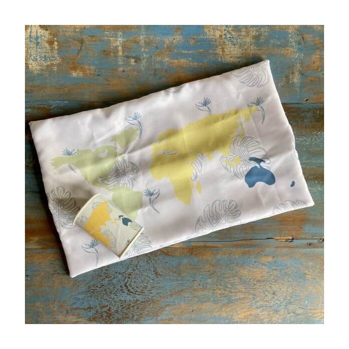 A capa de almofada retangular é confeccionada em tecido totalmente estampado (frente e verso), sendo a frente com estampa do mapa-múndi e o verso com estampa de fundo. A estampa mapa Brasil, possui duas variações de cores: branco e verde.