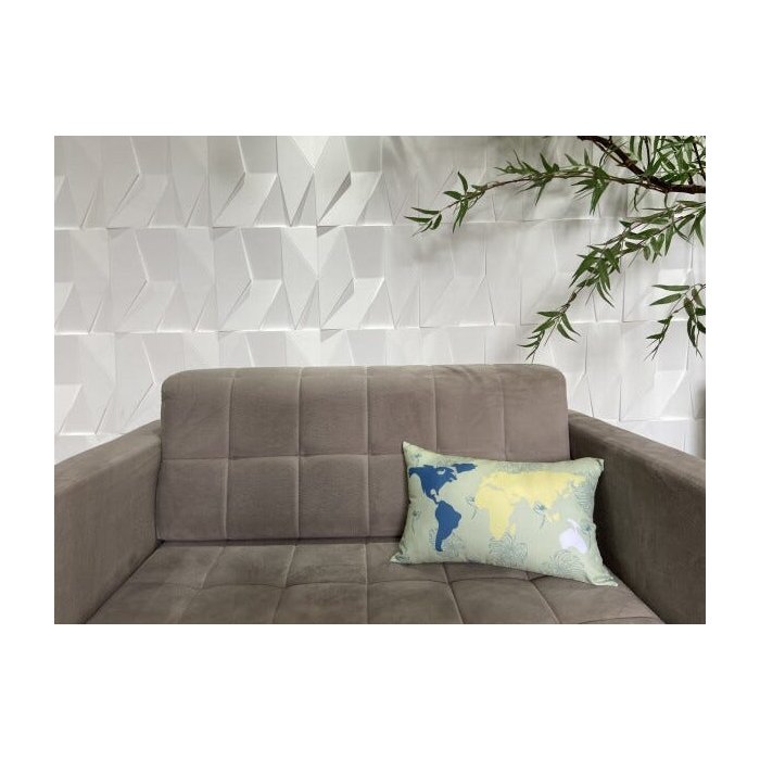 A capa de almofada retangular é confeccionada em tecido totalmente estampado (frente e verso), sendo a frente com estampa do mapa-múndi e o verso com estampa de fundo. A estampa mapa Brasil, possui duas variações de cores: branco e verde.