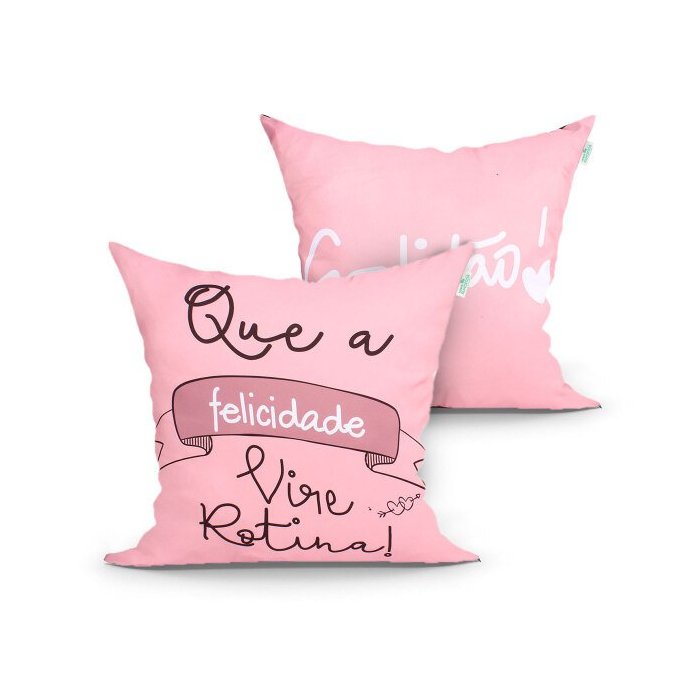 Capa de Almofada Que a Felicidade Vire Rotina e Gratidão Rosê Kit com 2 Unidades 45cm x 45cm com zíp