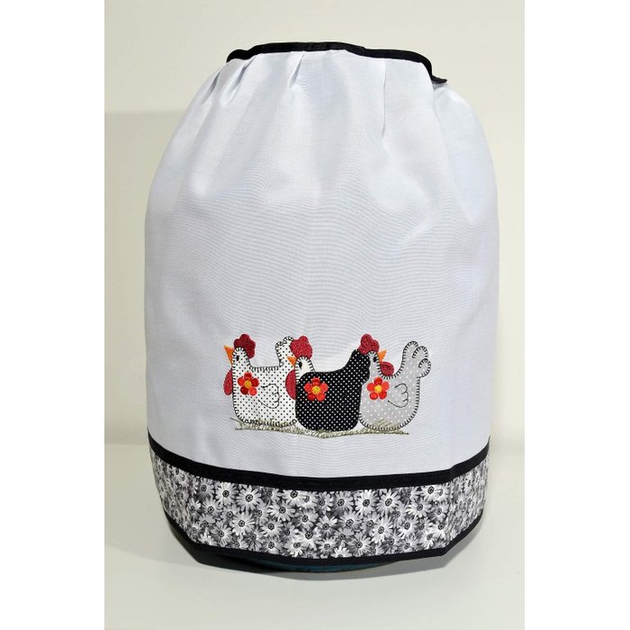 Capa de Botijão em Patchwork - Galinha PintadinhaEsta capa é linda e super prática! Capa de botijão confeccionada em tecido tergal branco, com três simpáticas galinhas em patchwork nas cores branco, preto e cinza de bolinhas, com estampas em bolinhas no patchwork e com barrado em toda a lateral na cor branco, cinza e preto floral.Essa linda capa é ideal para cobrir o galão de água, muito útil para decorar sua cozinha e manter seu galão protegido. A capa para galão da linha Arte & Tear dá um toque de charme para deixar as suas horas na cozinha mais divertida sem perder a beleza em seu dia-a-dia. Formado por: - 1 capa de botijão (1,14 x 0,50 m)*Capa para Botijão de 13 kg Composição: - 67% Poliéster- 33% algodão
