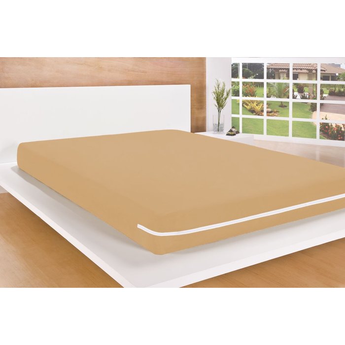 Capa de colchão fabricada em tecido 100% poliéster, na cor caqui e com ziper na cor branco em uma das laterais da capa.