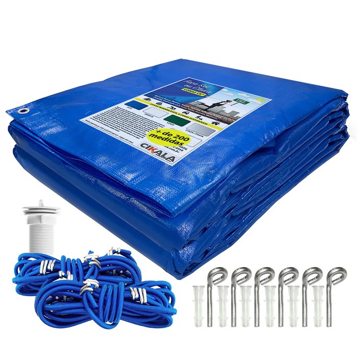 ATENÇÃO: ORIGINAL CK300 5 EM 1 - PINO EM ALUMÍNIO ANTI FERRUGEM, EVITE SUJEIRA - A MAIOR VARIEDADE - CIKALA PENHA SP PARA TODO BRASIL QUAL MEDIDA DEVO COMPRAR? Compre 50cm maior que sua piscina. Para uma piscina 6x3, utilize nossa capa 6,5x3,5 metros LONA CAPA CK300® PARA PROTEÇÃO DE PISCINA RESISTENTE A CLORO + KIT DE INSTALAÇÃO: 1 – Proteção contra sujeira; 2 – Kit completo para instalação; 3 – Anti-UV e antifúngica; 4 – Retenção térmica; 5 – PEAD impermeável biodegradável; KIT DE INSTALAÇÃO: - Buchas Brancas específicas para cloro; - Extensores elásticos duplos de 30cm; - Válvula para drenar água; - Exclusivos pinos em alumínio de 6,5mm: mais grosso e resistente, os únicos que não enferrujam e danificam o piso da piscina. CARACTERÍSTICAS: A Capa de Piscina CK300® 5 em 1 PEAD: evite sujeiras, folhas, insetos e a queda de temperatura quando exposta ao sereno ou vento. Pinos e extensores a cada metro que saem junto com a capa quando a mesma é removida, facilitando o manuseio. INSTALAÇÃO: 1 - Centralize a capa na piscina e faça marcações com uma distância de 25 cm para cada lado, em relação a borda da capa; 2 - Fure o chão a cada metro com uma broca tamanho 12 e insira as buchas; 3 - Fixe os extensores nos pinos com um nó e prenda-os nos ilhoses da capa. GARANTIA: Contra defeitos de fabricação. *Imagens Ilustrativas*