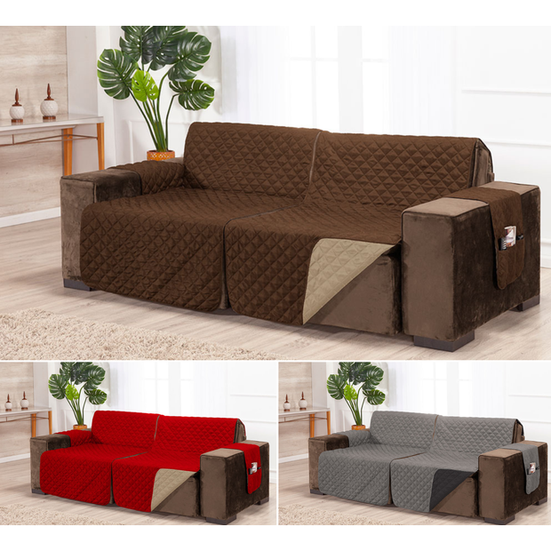 capa de sofá nas cores MARROM COM CAQUI, VERMELHO COM CAQUI, CINZA COM PRETO.