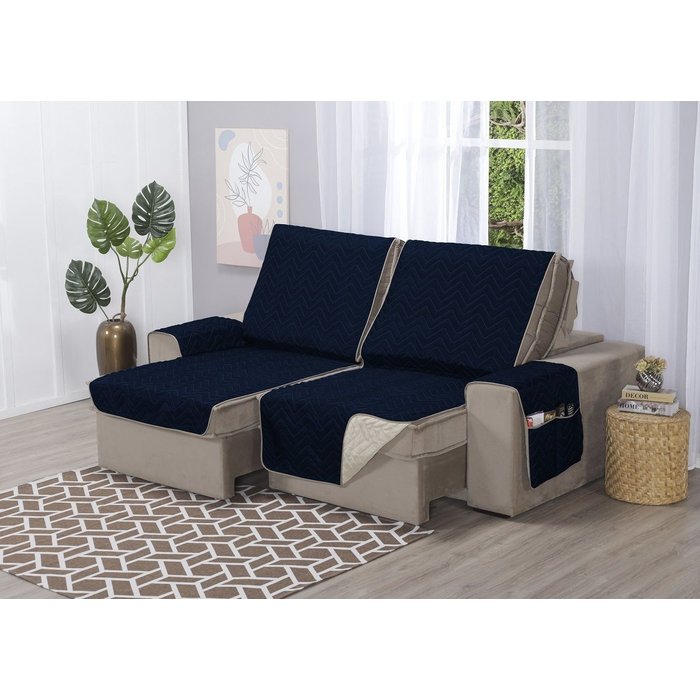 Capa de Sofá Retrátil Protetor 3 Lugares 1,80m de Assento Dupla Face Duas Cores:azul Marinho e Avelã Azul marinho e avelã bege