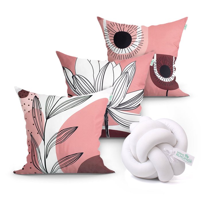 Capa para Almofada Rosê Estampada Decorativa 3 Unidades 45x45cm + Almofada Nó Escandinavo Decora