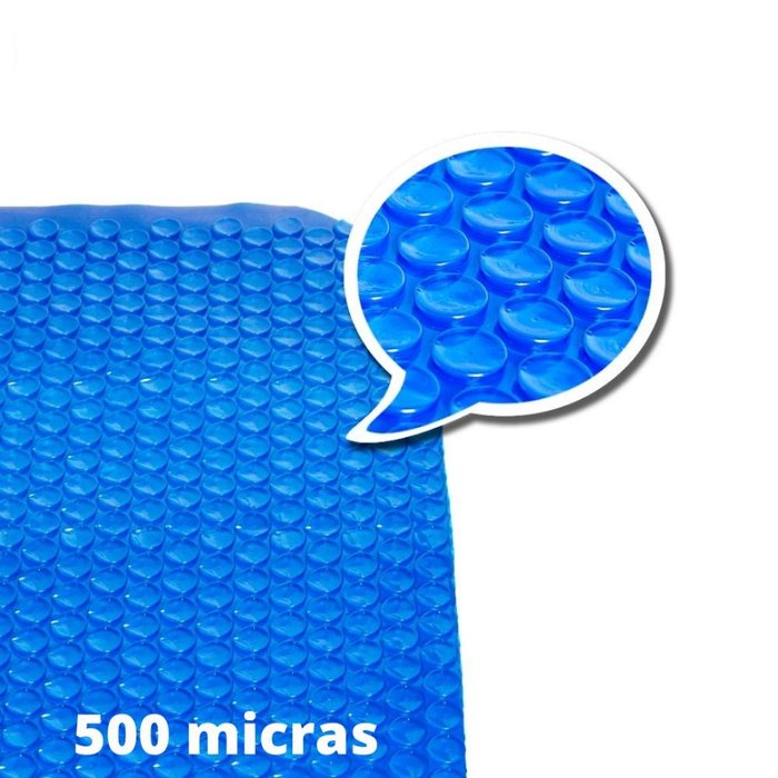 Capa Térmica Para Piscina Thermocap AZUL 500 micras A capa térmica para piscina é um produto especial para piscinas com ou sem sistema de aquecimento. A capa possui um shape com bolhas redondas que aumentam o isolamento térmico, reduzindo em até 75% as perdas de calor em uma piscina aquecida. Para piscinas arredondadas a capa vai retangular, podendo ser ajustado com tesoura ou estilete no espelho da piscina O aquecimento proporciona a passagem de energia solar, esse calor é potencializado pela capa e serve como uma tampa para aquecer a água da piscina, pois a capa tem a função de uma camada isolante do calor aumentando a temperatura da água em até 8 °C, com isso os custos de aquecimento da piscina podem ser reduzidos em até 50 % . Emendas em solda eletrônica dando fino acabamento Utilização e Cuidados: Usar a capa com as bolhas em contato com a água e o lado liso voltado para cima; Não é preciso nenhum tipo de alvenaria; Manter o PH da água entre 7,2 e 7,8; Manter o residual de cloro livre entre 1,03 e 3,0 ppm; Em Caso de Tratamento de Choque com cloro, remover a capa e retomar seu uso somente após a estabilização do nível ideal de cloro 1,0 a 3,0 ppm; Ao retirar a capa da piscina nunca deixe ao sol, mesmo por curtos períodos; Quando utilizar enrolador de capa para descobrir a piscina ,desloque -o para uma área de sombra ou cubra a capa com um protetor; Quando remover a capa, evite atrito das bolhas com as bordas da piscina . Garantia de 1 ano Durabilidade 2 a 4 anos Atenção: A capa térmica não são capas de segurança, portanto não suporta peso de adultos, crianças ou animais, podendo ocorrer acidentes e afogamentos por uso inadequado