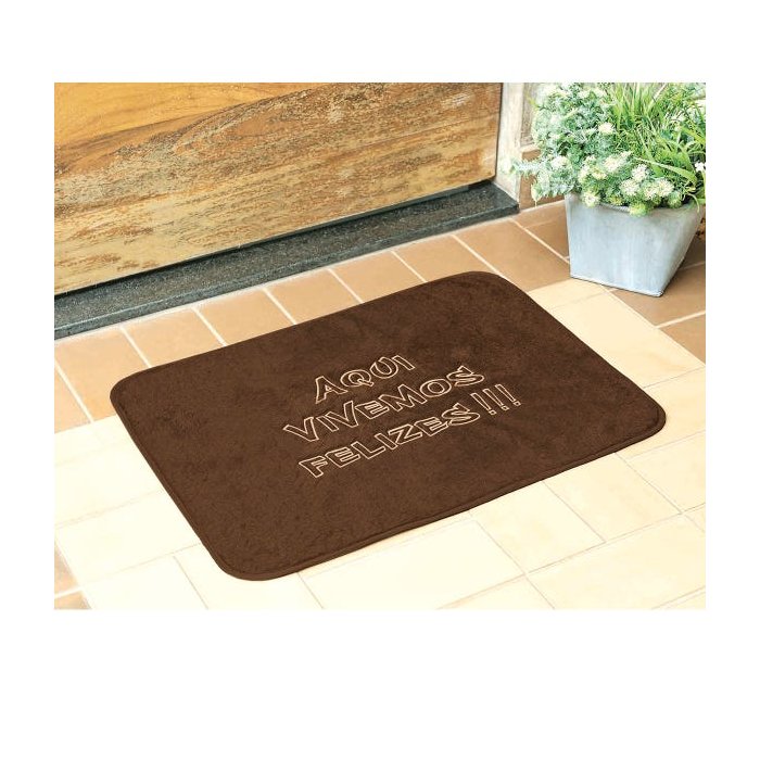 Capacho Tapete Frases Aqui Vivemos Felizes Tabaco 68cm x 48cm Antiderrapante para Porta