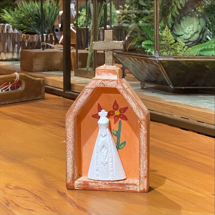 Capelinha artesanalmente produzida com imagem de Nossa Senhora Aparecida, todo feito em madeira. Possui uma cruz no topo. As peças que compõe o painel são pintadas à mão de maneira decorada e rústica. Podendo escolher entre as cores verde, amarelo, vermelho e laranja, a peça é um ótimo presente para os devotos da 'Cidinha' (como é, carinhosamente, chamada). A capelinha pode ser deixada em cima de um aparador ou mesa.