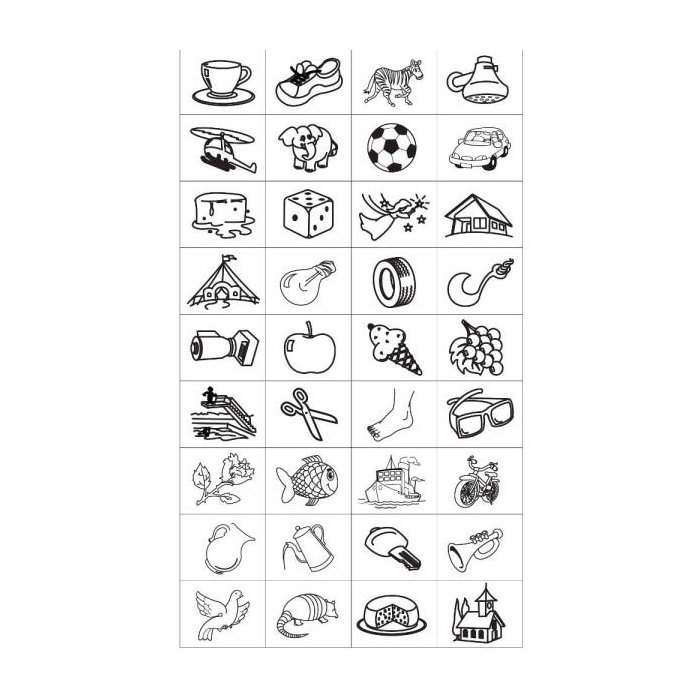 Carimbos de madeira, revestidos com borracha na parte inferior, 36 peças medindo 3,5 x 4,5 cm. Embalagem: Caixa de papel cartão, lacrada com película de P.V.C. encolhível. CE-BRI/ICEPEX - N 00928-96