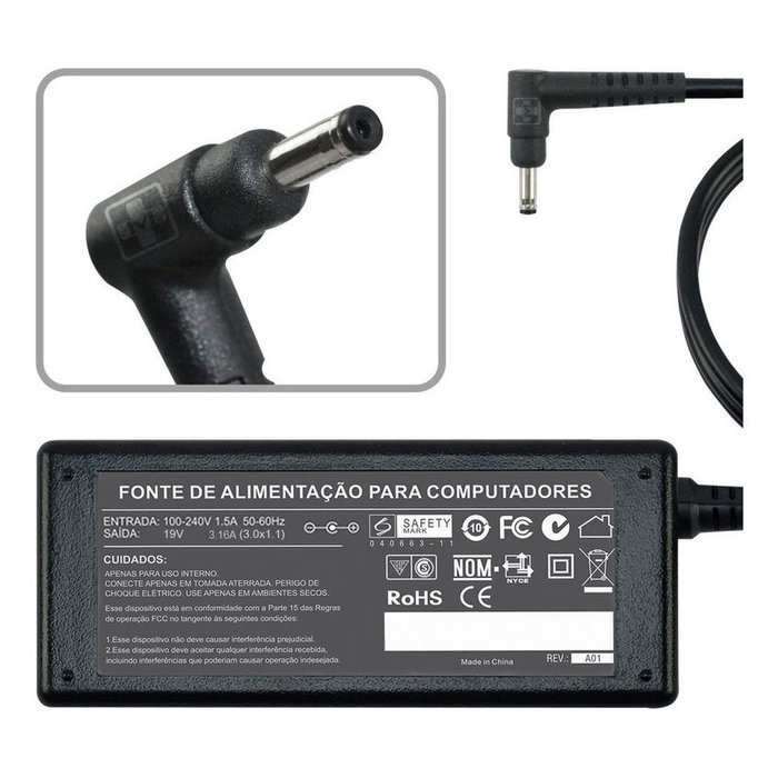 FONTE CARREGADOR PARA NOTEBOOK 19V 3.16A Plug. 3.01.1mm