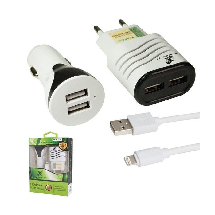 Carregador para Iphone Todos os Modelos - Kit 3 x 1 - Flex Gold Contém 1 cabo Lightning 1,2 m+ 1 Carregador tomada ultra rápido com 2 entradas USB + 1 Carregador veicular ultra rápido com 2 entradas USB. Possibilita a transmissão, sincronização ou carregamento do seu Smartphone á um computador ou receptor que possua porta USB. Compatível com Iphone 5, 5S, 5C, 6, 6S, 6 PLUS, 6S, 7 e 7 plus, 8, 9 e Iphone X Compatível com Ipad, Mini Ipad e Ipod Especificações: Carregador Veicular Entrada DC12/24v - 2.0A USB 1 Saída - DC.5V/1.0A USB 2 Saída - DC.5V/2.0A Carregador Parede Entrada - 100-240v (Bivolt) Saída - DC.5.0 - 2.1A Contém cabo Carregador Lightning 08 pinos