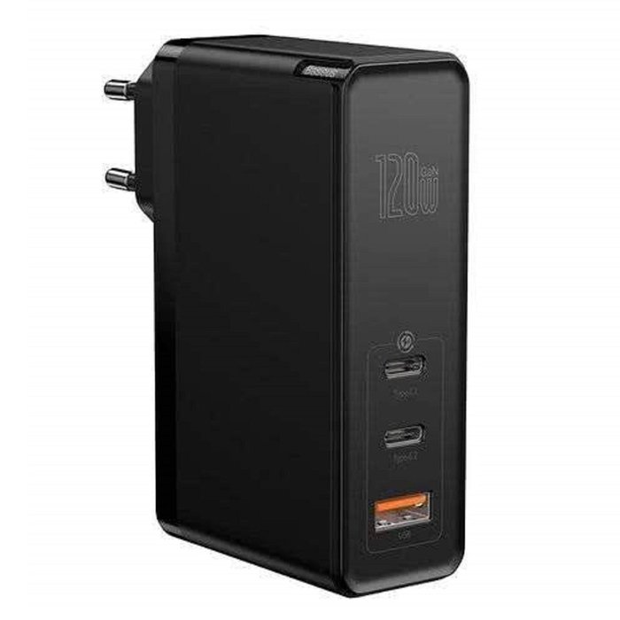 Carregador Parede Triplo Multiportas Entradas 2x USB-C + 1x USB 120w GaN Turbo Portátil Base - Preto Preto