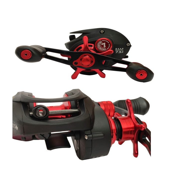 - Relação de Recolhimento: 7.3:1- Nº de Rolamentos: 6 +1 Rol. de Roletes- Manivela com Infinito Anti-Reverso- Material do Carretel: Alumínio- Freio do Carretel com Regulagem Ponto a Ponto- Freio Magnético c/ controle externo- Capacidade de linha: 0,28mm - 130m.- Freio Máx: 5,5kg- Peso: 200g
