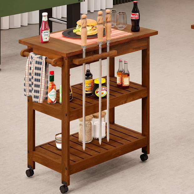 Fazer aquele churrasco de primeira é sem dúvida um dos melhores momentos para reunir família ou os amigos! Desta forma, ter um carrinho auxiliar de churrasco é super importante para servir refeições, acompanhamento ou bebidas com higiene e praticidade sem preocupações. Possui amplo espaço para armazenamento de acessórios ou condimentos em sua gaveta e suas prateleiras, suporte de espeto e suporte de talheres grandes. Sem abrir mão da beleza, o carrinho gourmet possui uma tábua de cortes móvel que o deixa ainda mais prático e contribui com a decoração da área de churrasco ou cozinha. Com ele a sua área gourmet está preparada para aquele final de semana! Dimensões do Carrinho (L x A x P) 51 x 90 x 70 cm Características: Estrutura em madeira maciça de Pinus, cor Imbuia. Tampo e estrutura de 20mm com Tábua de Cortes Móvel. Ferragem externa em metal na cor Preto. Rodízios para fácil locomoção. Suporte para talheres grandes, facas e espeto. Suporte para toalha. Possui 01 gaveta. Acabamento rústico em cera. Manter ao abrigo de local interno, sem ficar exposto diretamente ao sol, calor e umidade excessiva. Dica de conservação: Não deixe acumular sujeira em seu móvel. Esta sujeira se acumula nos poros, fazendo sua cor escurecer, realize a limpeza deste produto apenas com pano seco. Não cortar alimentos sobre a cerâmica, a prática pode riscar o espaço decorativo. Observações importantes: - Produto para uso residencial em ambiente interno, não devendo ficar exposto diretamente ao sol, calor e umidade excessivos. - Pode haver alguma diferença de tonalidade entre a imagem e o produto real, por conta do tratamento de imagens e a calibração de cores do seu monitor. - As imagens são meramente ilustrativas, não acompanham objetos de decoração e eletrônicos. - Ao receber a mercadoria, o cliente deve verificar as condições da embalagem, caso haja alguma avaria não assine o comprovante de recebimento. - Montagem, desmontagem e outras instalações serão de responsabilidade do cliente. Não nos responsabilizamos, no ato da entrega, por subir escadas/elevadores ou pelo transporte por guincho em apartamentos. Eventuais despesas são de responsabilidade do comprador. - Confira as dimensões do produto e certifique-se de que passará normalmente por supostos elevadores, portas, escadas e/ou corredores de sua residência.